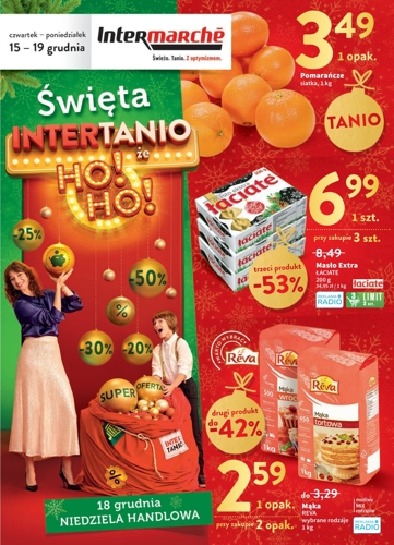 {loadposition linkIntermarche2} 'Święta Intertanio, że Ho!Ho!' - nowa gazetka promocyjna sieci sklepów Intermarche Polecane promocje z gazetki Intermarche: Pomarańcze 1 kg - 3,49 zł. Masło ekstra Łaciate 200 g - 6,99 zł*. Mąka Reva 1 kg - 2,59 zł**.…