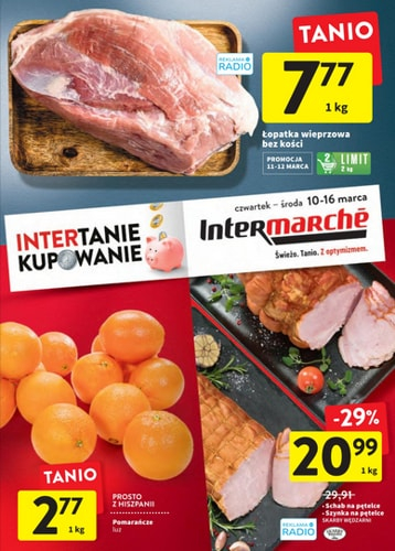 {loadposition linkIntermarche2} 'Intertanie kupowanie' - nowa gazetka promocyjna sieci sklepów Intermarche Polecane promocje z gazetki Intermarche: Łopatka wieprzowa bez kości 1 kg - 7,77 zł*. Pomarańcze 1 kg - 2,77 zł. Schab na pętlece Skarby Wędzarni 1 kg -…