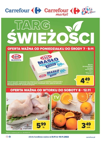{loadposition linkCarrefour4} 'Targ świeżosci' - nowa gazetka promocyjna sieci marketów Carrefour. Polecane promocje z gazetki Carrefour: Masło śmietankowe Polskie Mlekovita 200 g - 4,49 zł*. Ćwiartka z kurczaka 1 kg - 5,99 zł**. Pomarańcze 1 kg - 3,49 zł**.…