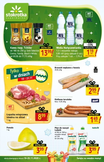 Nowa gazetka promocyjna sieci sklepów Stokrotka. Polecane promocje z gazetki Stokrotka: Kawa rozpuszczalna Tchibo 200 g - 13,99 zł. Woda Nałęczowianka 6x1,5 L - 7,14 zł. Pomelo 1 kg - 3,99 zł. Oferta ważna od czwartku 19.11…