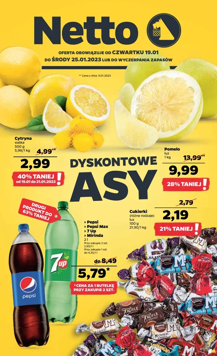 {loadposition linkNetto3} 'Dyskontowe asy' - nowa gazetka promocyjna sieci sklepów Netto. Polecane promocje z gazetki Netto: Cytryny siatka 500 g - 2,99 zł*. Pomelo 1 kg - 9,99 zł. Cukierki 100 g - 2,19 zł. * - 40%…