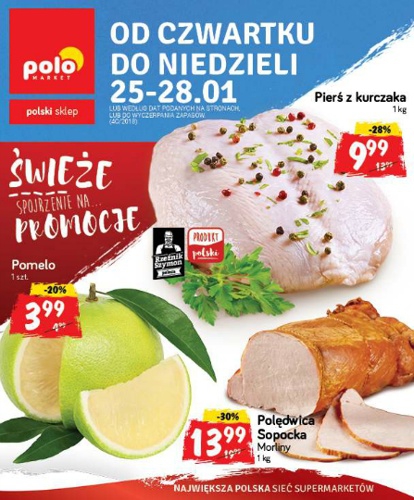{loadposition linkPoloMarket} Nowa gazetka promocyjna Polo Market - "Świeże spojrzenie na... promocje". Polecane promocje z gazetki Polo Market: Pomelo 1 sztuka - 3,99 zł. Pierś z kurczaka 1 kg - 9,99 zł. Polędwica sopocka Morliny 1…