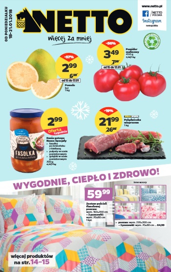 {loadposition linkNetto} Nowa gazetka promocyjna sieci sklepów Netto - "Wygodnie, ciepło i zdrowo!". Polecane promocje z gazetki Netto: Zestaw pościeli flanelowej - 59,99 zł. Pomelo 1 kg - 2,99 zł. Polędwiczka wieprzowa 1 kg - 21,99 zł.…