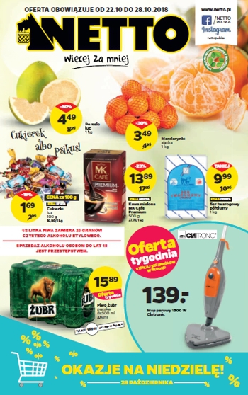 {loadposition linkNetto} 'Oferta tygodnia' - nowa gazetka promocyjna sieci sklepów Netto. Polecane promocje z gazetki Netto: Pomelo 1 kg - 4,49 zł. Mandarynki 1 kg - 3,49 zł. Ser twarogowy półtłusty 1 kg - 9,99 zł. …