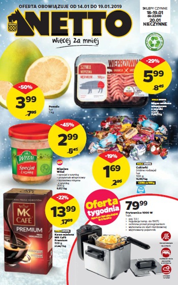 {loadposition linkNetto} Nowa gazetka promocyjna sieci sklepów Netto. Polecane promocje z gazetki Netto: Pomelo 1 kg - 3,99 zł. Kawa mielona MK Cafe Premium 500 g - 13,99 zł. Frytownica 1000 W - 79,99 zł. …