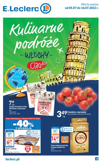 {loadposition linkEleclerc3} 'Kulinarne podróże - Ciao!!! Włochy' - nowa gazetka promocyjna sieci handlowej E.Leclerc. Polecane promocje z gazetki E.Leclerc: Szynka Prosciutto Cotto Casa Modena 125 g - 7,99 zł. Pomidory czerwone 1 kg - 3,49 zł*. Kawa mielona lub…