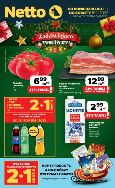 {loadposition linkNetto} 'Zadziwiająco tanie święta' - nowa gazetka promocyjna sieci sklepów Netto. Polecane promocje z gazetki Netto: Pomidory czerwone 1 kg - 6,99 zł. Boczek wieprzowy surowy Sztuka Mięsa 1 kg - 12,99 zł*. Mleko Uchate Polmlek 1 L…
