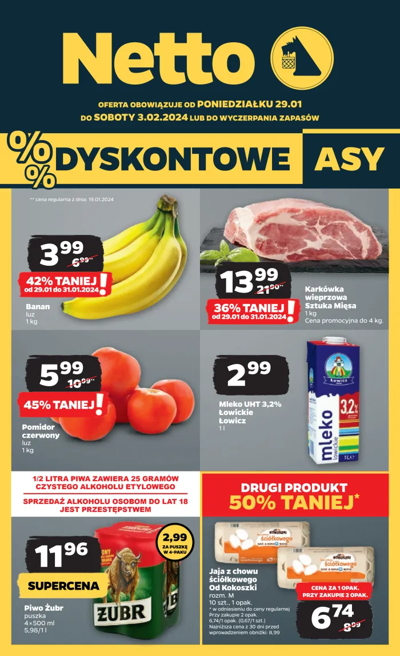 {loadposition linkNetto5} 'Dyskontowe asy tygodnia' - nowa gazetka promocyjna sieci sklepów Netto. Polecane promocje z gazetki Netto: Pomidory czerwone 1 kg - 6,99 zł. Boczek wieprzowy surowy Sztuka Mięsa 1 kg - 12,49 zł*. Mleko Wypasione Mlekovita 1 L…