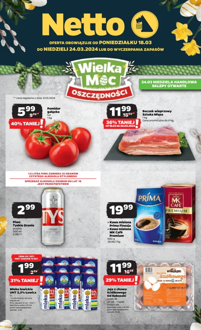 'Wielka Moc Oszczędności' - nowa gazetka promocyjna sieci sklepów Netto. Polecane promocje z gazetki Netto: Pomidory gałązka 1 kg - 5,99 zł. Boczek wieprzowy Sztuka Mięsa 1 kg - 11,99 zł*. Piwo Tyskie w puszce 500 ml - 2,99…
