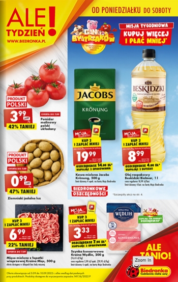 {loadposition linkBiedronka1} 'Ale tydzień!' - nowa gazetka promocyjna sieci sklepów Biedronka. Polecane promocje z gazetki sieci Biedronka: Pomidory malinowe polskie układane 1 kg - 3,99 zł*. Ziemniaki jadalne 1 kg - 0,99 zł*. Kawa mielona Jacobs Kronung 2x500 g…