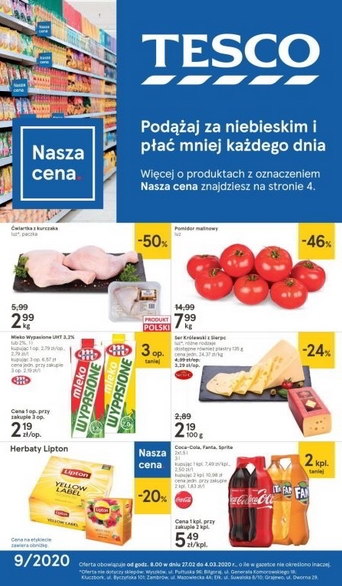 'Nasza cena. Podążaj za niebieskim i płać mniej każdego dnia' - nowa gazetka promocyjna sieci sklepów Tesco. Polecane promocje z gazetki Tesco: Ćwiartka z kurczaka 1 kg - 2,99 zł. Pomidory malinowe 1 kg - 7,99 zł.…