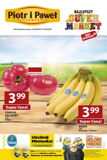 Nowa gazetka promocyjna sieci sklepów Piotr i Paweł. Pomidory malinowe 1 kg - 3,99 zł. Banany 1 kg - 3,99 zł. Płatki Nestle 500 g - 6,99 zł. Oferta ważna od 13.06 do 18.06 lub…