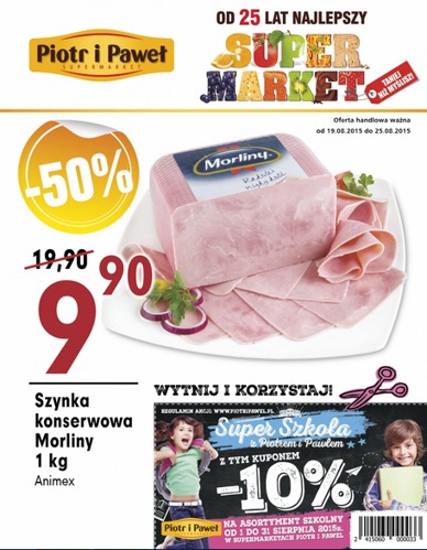Nowa gazetka promocyjna sieci sklepów Piotr i Paweł. Polecane promocje z gazetki Piotr i Paweł: Szynka konserwowa Morliny 1 kg - 9,90 zł. Pomidory malinowe 1 kg - 3,99 zł. Śliwki 1 kg - 1,99 zł. Oferta…