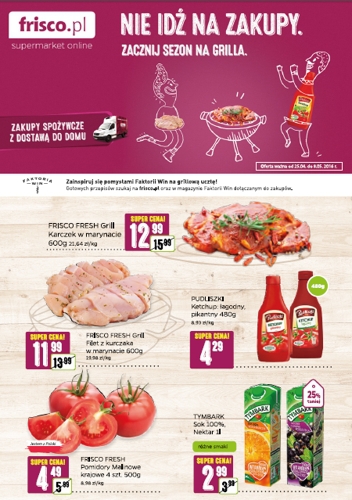Nowa gazetka promocyjna supermarketu internetowego Frisco.pl - "Nie idź na zakupy. Zacznij sezon na grilla". Polecane promocje z gazetki Frisco.pl: Karczek w marynacie Fresco Fresh Grill 600 g - 12,99 zł. Filet z kurczaka w marynacie Fresco Fresh…