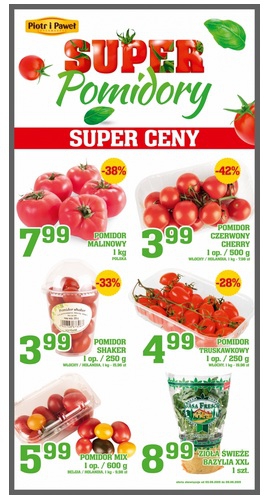 Nowa gazetka promocyjna sieci sklepów Piotr i Paweł - "Super pomidory". Polecane promocje z gazetki Piotr i Paweł: Pomidory malinowe 1 kg - 7,99 zł. Pomidory czerwone cherry 500 g - 3,99 zł. Świeża bazylia 1 sztuka -…