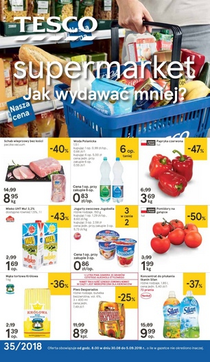 'Jak wydawać mniej?' - nowa gazetka promocyjna sieci sklepów Tesco. Polecane promocje z gazetki Tesco: Schab wieprzowy bez kości 1 kg - 8,95 zł. Papryka czerwona 1 kg - 3,69 zł. Pomidory na gałązce 1 kg -…