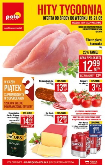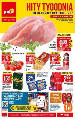 'Hity tygodnia' - nowa gazetka promocyjna sieci sklepów Polo Market. Polecane promocje z gazetki Polo Market: Filet z piersi kurczaka 1 kg - 9,99 zł*. Pomidory na gałązce 1 kg - 2,99 zł**. Ser Królewski OSM Sierpc…