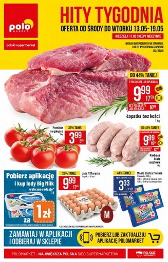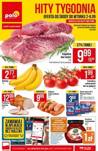 'Hity tygodnia' - nowa gazetka promocyjna sieci sklepów Polo Market. Polecane promocje z gazetki Polo Market: Łopatka bez kości 1 kg - 9,99 zł*. Pomidory na gałązce 1 kg - 3,99 zł. Kielbasa biała rusztowa 1 kg…