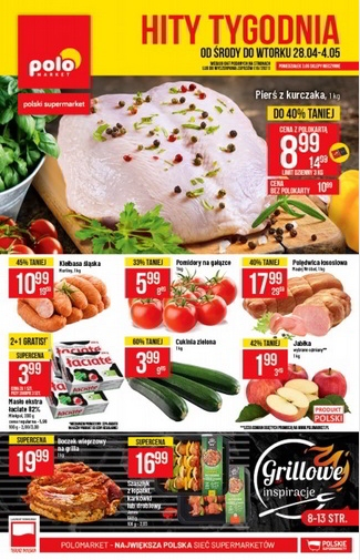 {loadposition linkPoloMarket} 'Hity tygodnia' - nowa gazetka promocyjna sieci sklepów Polo Market. Polecane promocje z gazetki Polo Market: Filet z piersi kurczaka 1 kg - 12,99 zł*. Kiełbasa żywiecka Madej Wróbel 1 kg - 13,99 zł. Pomidory…