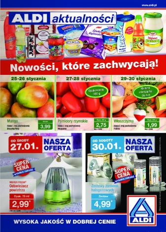 {loadposition linkAldi} Nowa gazetka promocyjna Aldi - "Nowości, które zachwycają!". Polecane promocje z gazetki Aldi: Odświeżacz powietrza Mister Fresh 75 ml - 2,99 zł. Zestaw żarówek halogenowych - 4,99 zł. Pomidory rzymskie 500 g - 2,75 zł. Oferta…