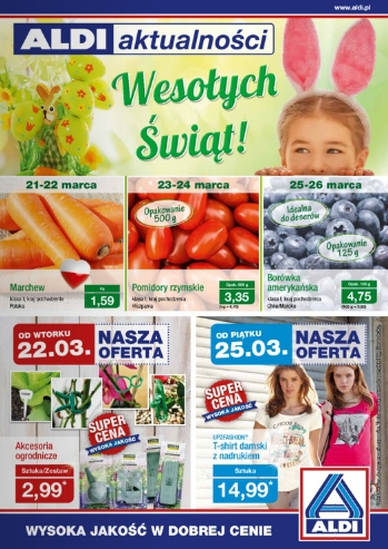 {loadposition linkAldi} Nowa gazetka promocyjna Aldi. Polecane promocje z gazetki Aldi: T-shirt damski z nadrukiem - 14,99 zł. Marchew 1 kg - 1,59 zł. Pomidory rzymskie 500 g - 3,35 zł. Oferta ważna od 22.03 do wyczerpania zapasów.