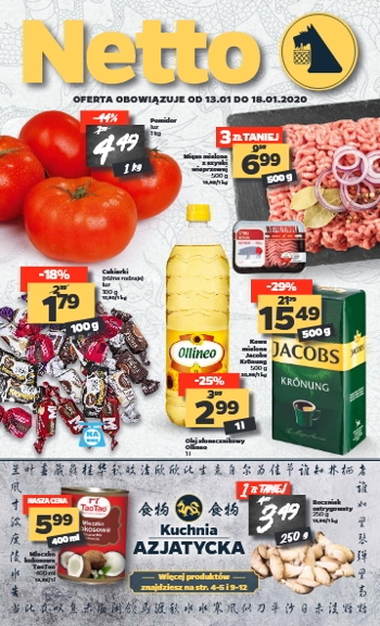 Nowa gazetka promocyjna sieci sklepów Netto. Polecane promocje z gazetki Netto: Pomidory 1 kg - 4,49 zł. Mięso mielone z szynki wieprzowej 500 g - 6,99 zł. Olej słonecznikowy Ollineo 1 L - 2,99 zł. Oferta ważna…