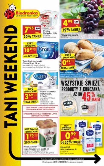{loadposition linkBiedronka2} 'Tani weekend' - nowa gazetka promocyjna sieci sklepów Biedronka. Polecane promocje z gazetki sieci Biedronka: Praliny Raffaello 150 g - 7,95 zł. Tabletki do zmywarki Kraft 2x50 sztuk - 21,98 zł. Papier toaletowy Biały Queen 2x8 rolek…
