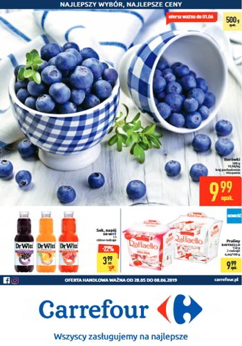 {loadposition linkCarrefour} Nowa gazetka promocyjna sieci marketów Carrefour. Polecane promocje z gazetki Carrefour: Borówki 500 g - 9,99 zł. Sok lub napój Dr Witt 1 L - 3,99 zł. Praliny Raffaello 150 g - 9,99 zł. …
