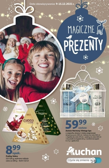 {loadposition linkAuchan3} 'Magiczne prezenty' - nowa gazetka promocyjna sieci supermarketów Auchan. Polecane promocje z gazetki Auchan: Zestaw Harmony Vintage Spa - 59,99 zł. Praliny Vobro 112 g - 8,99 zł. Praliny Raffaello 270 g - 19,99 zł. …