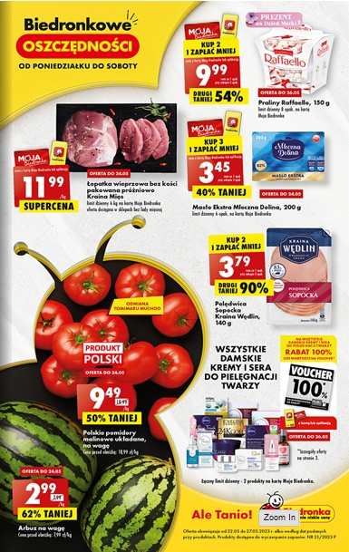 {loadposition linkBiedronka1} 'Biedronkowe oszczędności od poniedziałku do soboty' - nowa gazetka promocyjna sieci sklepów Biedronka. Polecane promocje z gazetki sieci Biedronka: Łopatka wieprzowa bez kości pakowana próżniowo Kraina Mięs 1 kg - 11,99 zł*. Praliny Raffaello 150 g -…