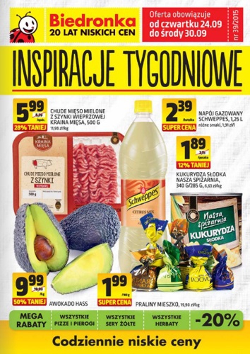 {loadposition linkBiedronka} Nowa gazetka promocyjna sieci handlowej Biedronka - "Inspiracje Tygodniowe". Polecane promocje z gazetki sieci Biedronka: Chude mięso mielone z szynki wieprzowej Kraina Mięsa 500 g - 5,99 zł. Awokado Hass 1 kg - 9,99 zł. Praliny Mieszko…