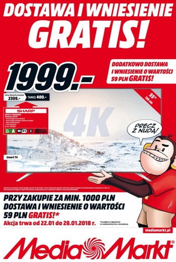 {loadposition linkMediaMarkt} Nowa gazetka promocyjna Media Markt - "Dostawa i wniesienie gratis!". Polecane promocje z gazetki Media Markt: Telewizor 4K Ultra HD 55 cali SHARP LC-55CUG8062E - 1999 zł. Lodówka MPM 182-KB-33 - 849 zł. Pralka SAMSUNG WW70J4273MW/EO -…