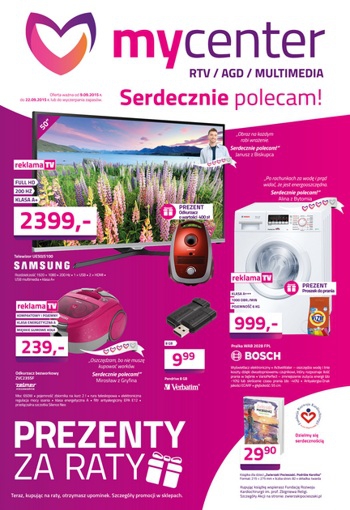 Nowa gazetka promocyjna sieci sklepów MyCenter - "Serdecznie polecam!". Polecane promocje z gazetki MyCenter: Telewizor LED 50" SAMSUNG UE50J5100 + Odkurzacz SAMSUNG VCC61E4V3R - 2399 zł. Pralka BOSCH WAB 2028 FPL + proszek do prania Vizir - 999…