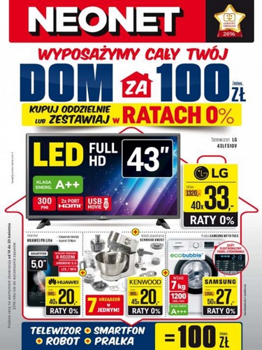 {loadposition linkNeonet} Nowa gazetka promocyjna Neonet - "Wyposażymy cały Twój dom za 100 zł miesięcznie". Polecane promocje z gazetki Neonet: Telewizor LED 43" LG 43LF510V - 1320 zł. Smartfon HUAWEI P8 LITE DUAL SIM - 800 zł. Pralka SAMSUNG…