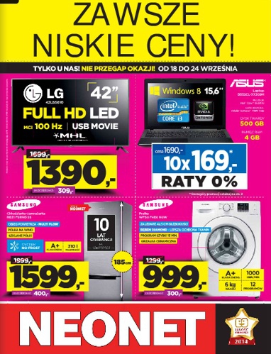 {loadposition linkNeonet} Nowa gazetka promocyjna Neonet - "Zawsze niskie ceny". Polecane promocje z gazetki Neonet: Telewizor LED 42" LG42LB5610 - 1390 zł. Laptop ASUS D552CL-XX309H - 1690 zł. Pralka Samsung WF60 F4EO NOW - 999 zł. Oferta ważna…