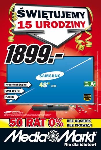 {loadposition linkMediaMarkt} Nowa gazetka promocyjna Media Markt - "Świętujemy 15 urodziny". Polecane promocje z gazetki Media Markt: Telewizor LED 48" SAMSUNG UE48H5000AW - 1899 zł. Odtwarzacz sieciowy SAMSUNG Multiroom WAM350 - 999 zł. Pralka WHIRLPOOL AWSP 63213P - 999…