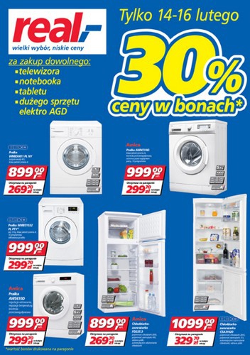 Nowa gazetka promocyjna sieci handlowej Real - "30% ceny w bonach" . Polecane promocje z gazetki Real: Pralka BEKO WMB50811 PL NY - 899 zł. Pralka Amica AWS610D - 999 zł. Chłodziarko-zamrażarka Amica FD225.3 - 899 zł. …