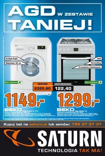 {loadposition linkMediaMarkt} Nowa gazetka promocyjna Saturn - "AGD w zestawie taniej". Polecane promocje z gazetki Saturn: Pralka BEKO WMB 61232 PL PTM - 1149 zł. Kuchnia BEKO CSM 52322 DX - 1299 zł. Odkurzacz SAMSUNG SC21F50VA VC21F50VNAR/GE - 579…