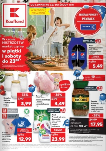 {loadposition linkKaufland} 'Zbieraj punkty Payback' - nowa gazetka promocyjna sieci marketów Kaufland. Polecane promocje z gazetki Kaufland: Napój gazowany Pepsi 2x2 L - 5,49 zł. Kurczak tuszka klasa A 1 kg - 4,49 zł. Proszek do prania 3 kg…