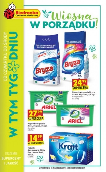 {loadposition linkBiedronka} 'Wiosna w porządku' - nowa gazetka promocyjna sieci sklepów Biedronka. Polecane promocje z gazetki sieci Biedronka: Proszek do prania Bryza Lanza 6,9 kg - 24,99 zł. Kapsułki do prania Ariel 35 sztuk - 27,99 zł. Tabletki…
