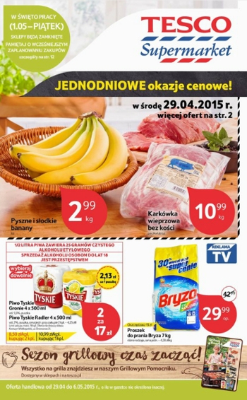 Nowa gazetka promocyjna Tesco. Polecane promocje z gazetki Tesco: Banany 1 kg - 2,99 zł. Karkówka wieprzowa bez kości 1 kg - 10,99 zł. Proszek do prania Bryza 7 kg - 29,99 zł. Oferta ważna od 29.04…