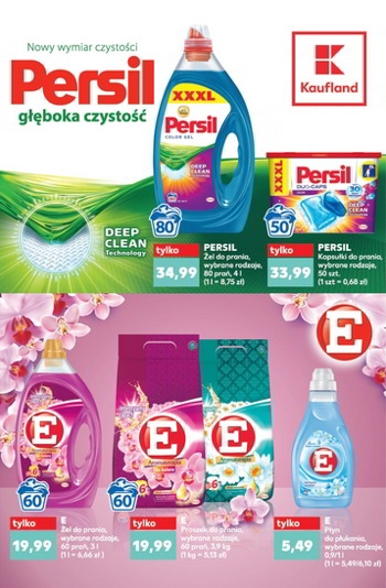 {loadposition linkKaufland} 'Nowy wymiar czystości' - nowa gazetka promocyjna sieci marketów Kaufland. Polecane promocje z gazetki Kaufland: Żel do prania Persil 4 L 80 prań - 34,99 zł. Proszek do prania E 3,9 kg 60 prań - 19,99 zł.…
