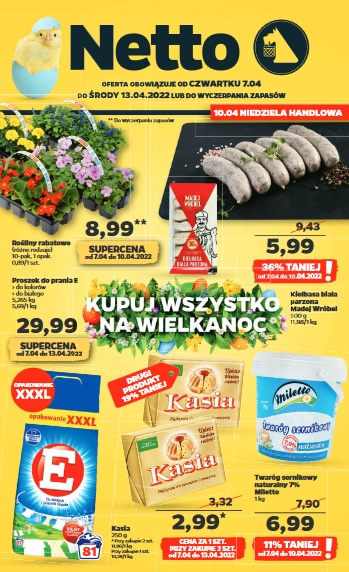 {loadposition linkNetto} 'Kupuj wszystko na Wielkanoc' - nowa gazetka promocyjna sieci sklepów Netto. Polecane promocje z gazetki Netto: Rośliny rabatowe 10 sztuk - 8,99 zł*. Kiełbasa biała parzona Madej Wróbel 500 g - 5,99 zł**. Proszek do prania E…