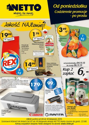 {loadposition linkNetto} Nowa gazetka promocyjna Netto - "Codziennie promocje - po prostu". Polecane promocje z gazetki Netto: Proszek do prania Rex 6 kg - 19,99 zł. Piwo Kasztelan Niepasteryzowane 500 ml - 1,79 zł. Urządzenie wielofunkcyjne Canon -…