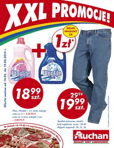 {loadposition linkAuchan} Nowa gazetka promocyjna Auchan - "XXL Promocje!". Polecane promocje z gazetki Auchan: Spodnie jeansowe męskie - 19,99 zł. Płyn Woolite Perła 2 L 2 sztuki - 19,99 zł. Proszek do prania Rex 4 kg 2 sztuki -…