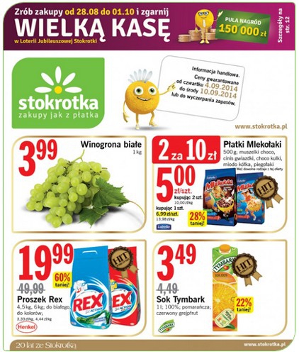 Nowa gazetka promocyjna sieci handlowej Stokrotka. Polecane promocje z gazetki Stokrotka: Winogrono białe 1 kg - 3,99 zł. Sok Tymbark 1 L - 3,49 zł. Proszek do prania Rex 4,5 kg - 19,99 zł. Oferta ważna od…