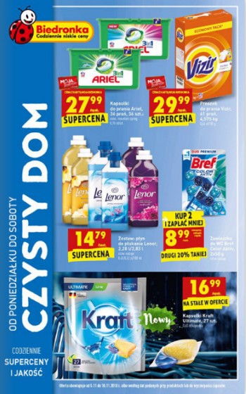 {loadposition linkBiedronka} 'Czysty dom' - nowa gazetka promocyjna sieci sklepów Biedronka. Polecane promocje z gazetki sieci Biedronka: Kapsułki do prania Ariel 36 sztuk - 27,99 zł*. Proszek do prania Vizir 61 prań - 29,99 zł*. Kapsułki do zmywarki Kraft…