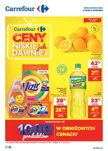 {loadposition linkCarrefour4} 'Ceny niskie jak dawniej' - nowa gazetka promocyjna sieci marketów Carrefour. Polecane promocje z gazetki Carrefour: Pomarańcze 1 kg - 2,89 zł. Proszek, żel lub kapsułki do prania Vizir - 26,99 zł. Olej Kujawski 2x1 L -…