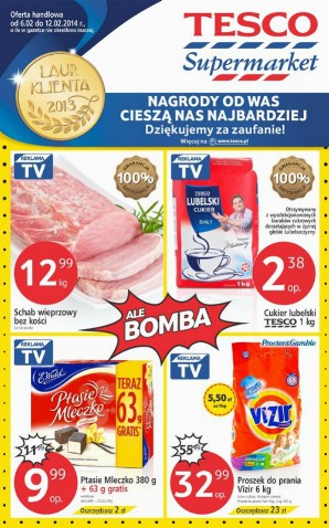Nowa gazetka promocyjna Tesco - "Ale bomba". Polecane promocje z gazetki Tesco: Schab wieprzowy bez kości 1 kg - 12,99 zł. Cukier Lubelski Tesco 1 kg - 2,38 zł. Proszek do prania Vizir 6 kg - 32,99 zł.…