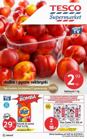 Nowa gazetka promocyjna Tesco. Polecane promocje z gazetki Tesco: Nektarynki 1 kg - 2,99 zł. Proszek do prania Vizir 4,2 kg - 29,99 zł. Piwo Żywiec 8x500 ml - 18 zł. Oferta ważna od 10.07 do 16.07,…